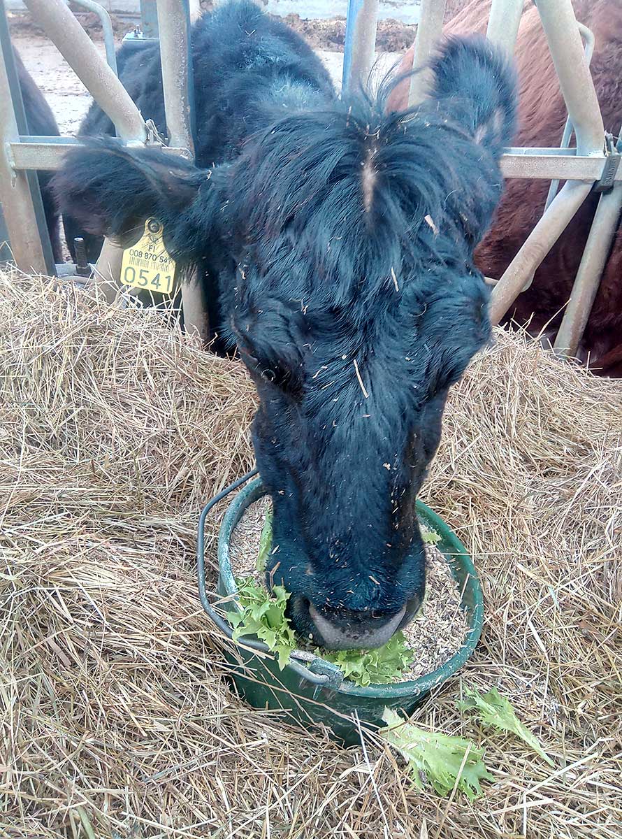 Viimeinen mohikaani tuosta ryhmästä on vielä jäljellä! Hän on kokonaan musta ja sarveton. Karva ei ole enää kovin kiiltävä, mutta ajatus juoksee ja terveys on hyvä. Hänen nimensä on Santa, mutta kuten moni muukin karjamme ostoeläimistä, hän kulkee lempinimellä 144, joka on siis hänen korvanumeronsa. Tuntee myös nimen mummo.