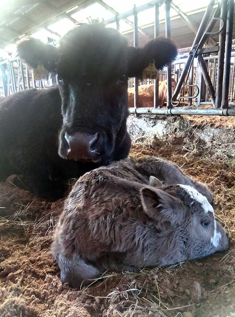 Hän on tiine ja seuraavan vasikan laskettu aika on 13.4.23, se on hänen 16. vasikkansa. Tähän asti hän on poikinut jokaisen vasikkansa ilman avustusta nopeasti ja näppärästi. Hän ei ole ihan puhdasrotuinen, mutta hänen rotunsa on Aberdeen Angus, joka on merkitty hänen isänsä mukaan. Angus on rotuna reipas ja vikkelä ja myös hän on ollut nuorena sitä tyyliä. Vanhuus on kuitenkin tuonut arvokkuutta askeleeseen, joten hän ei enää turhia hötkyile, vaan on hyvin kiltti ja rauhallinen, lempeä emo. Toisiin emoihin verrattuna hän on pienikokoinen ja pulleamahainen, ei mikään lihaskimppu.