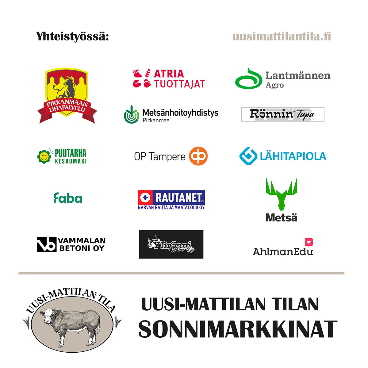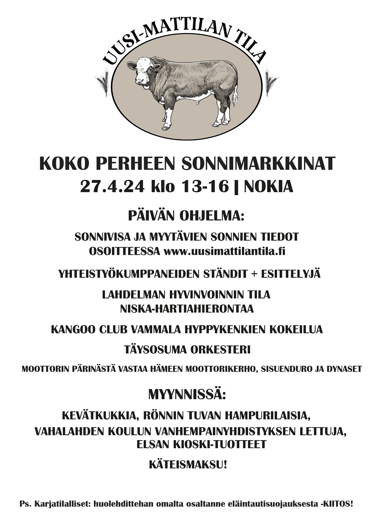 Uusi-Mattilan tila Sarkolantie 620 37180 Sarkola Kartta ja reittiohjeet (Google Maps) Tee sonnivisa Sonnivisa Tiedätkö mikä on INNOSTUNUT SONNI takaperin? Mitä kaikkea muuta tiedätkään sonneista? Olisitko itsekään uskonut? Ja aina voi myös arvata! Kaikkien vastanneiden kesken arvotaan Uusi-Mattilan tilan tuotepaketteja! 1 / 8 Sonni on: Naaraspuoleinen nauta Urospuoleinen nauta Härän veli 2 / 8 Liharotuinen sonnivasikka painaa syntyessään keskimäärin noin: 16 kg 46 kg 86 kg 3 / 8 Lehmällä on neljä mahaa: Pötsi, verkkomaha, satakerta ja juoksutusmaha. Montako mahaa on sonnilla? 1 2 4 4 / 8 Liharotuinen sonni voi painaa vuoden ikäisenä parhaimmillaan? 100 kg 350 kg 800 kg 5 / 8 Jos sonnilla ei ole sarvia, sanotaan että se on? Nupo Söpö Härkä 6 / 8 Onko sonnin äiti nimeltään? Lehmä Hieho Tamma 7 / 8 Sonnin väritys EI koskaan ole? Ruskea Musta Kirkkaan keltainen 8 / 8 Sonnin ensimmäinen ruoka vastasyntyneenä on? Ternimaito Piimä Heinä Ole hyvä ja anna nimesi ja sähköpostiosoitteesi, jotta voimme arpoa palkinnon. Your score isThe average score is 90% 0% Aloita uudelleen